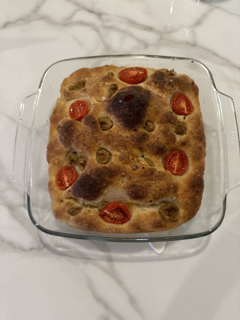 - Fırınınızı 220 dereceye ısıtın. Hamurun üzerine kalan iki yemek kaşığı zeytinyağını ekleyin ve bazı noktalarda hafifçe bastırıp delikler yaratarak elinizle dağıtın. İsteğe bağlı olarak taze biberiye, diğer baharatlar, zeytin, domates veya tuz ekleyin. Fırına alın. Altı kızarana kadar (yaklaşık 25 dk.) pişirin.